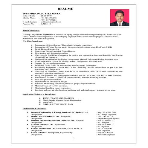Resume Piping Design Engineer 13 Years Exp Pdf